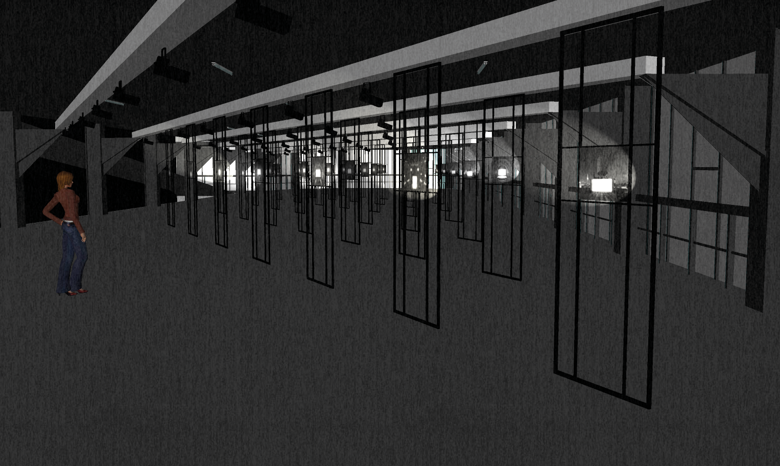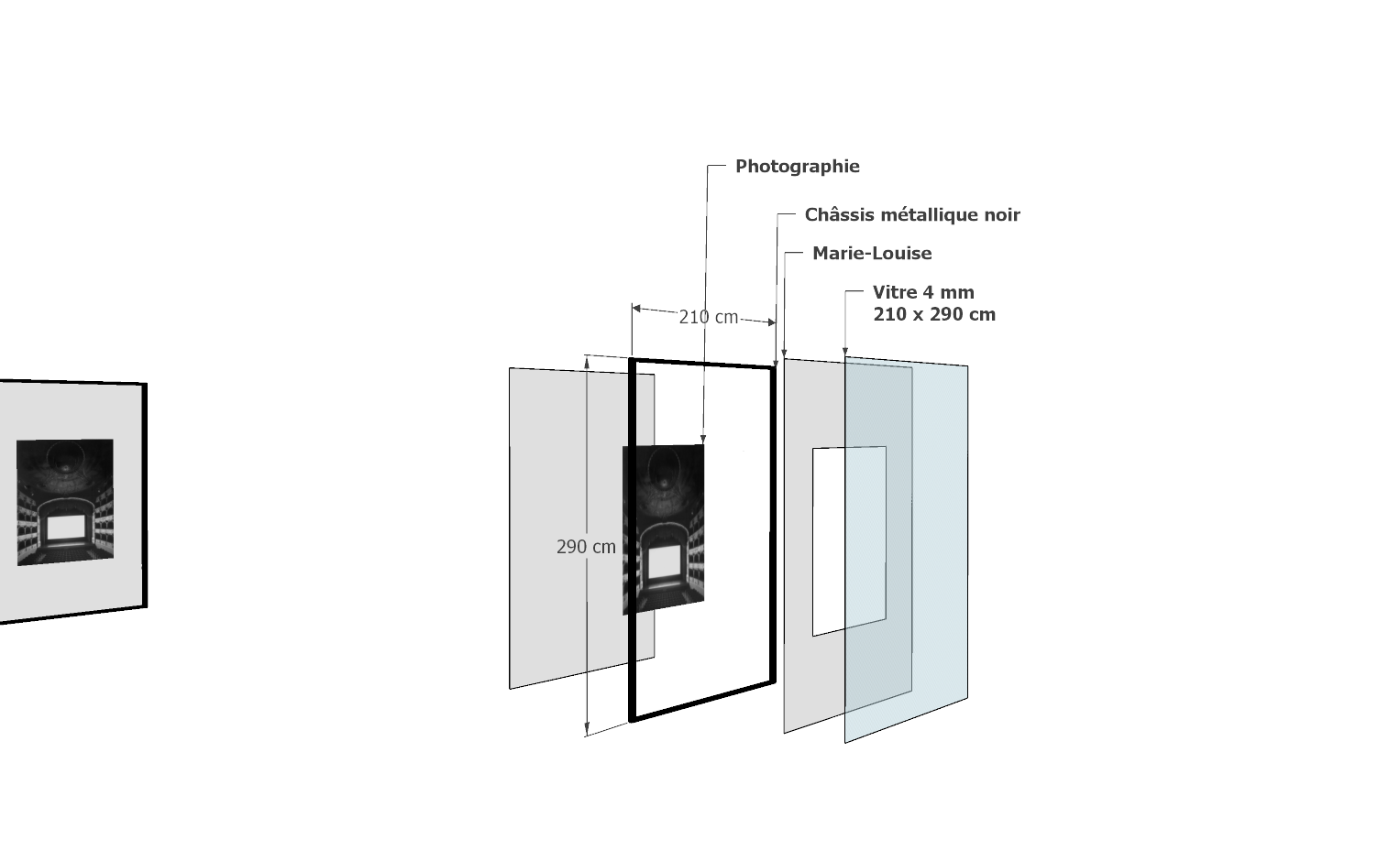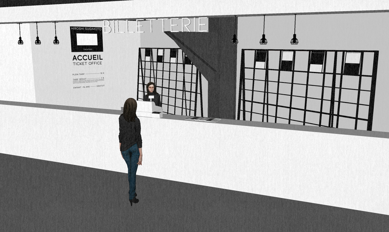 Sugimoto en reprenant l’idée de fenêtre, de cadrage et de cadre de scène, et l’espace de Kanal en reprenant les châssis métalliques noirs des fenêtres. En accord avec les photographies, le dispositif est basé sur le noir et le blanc.