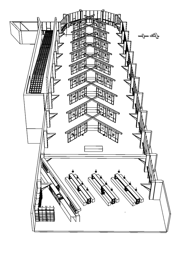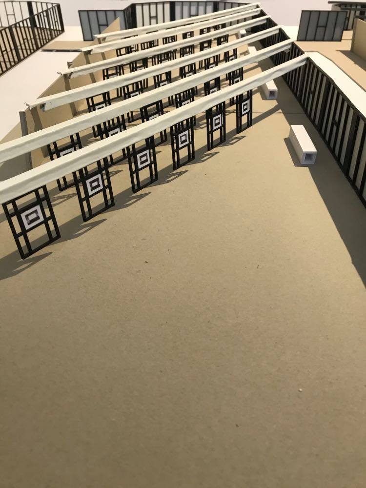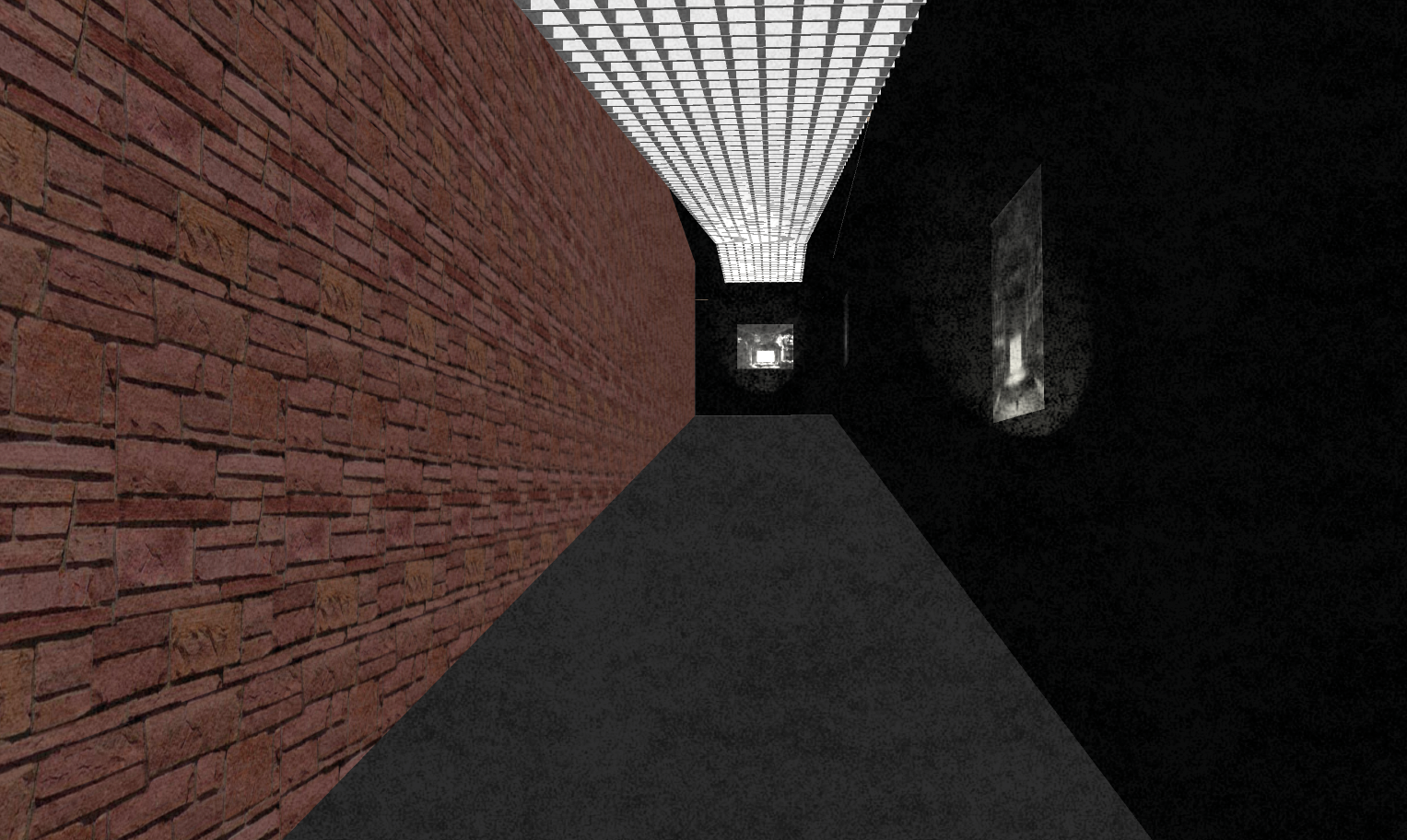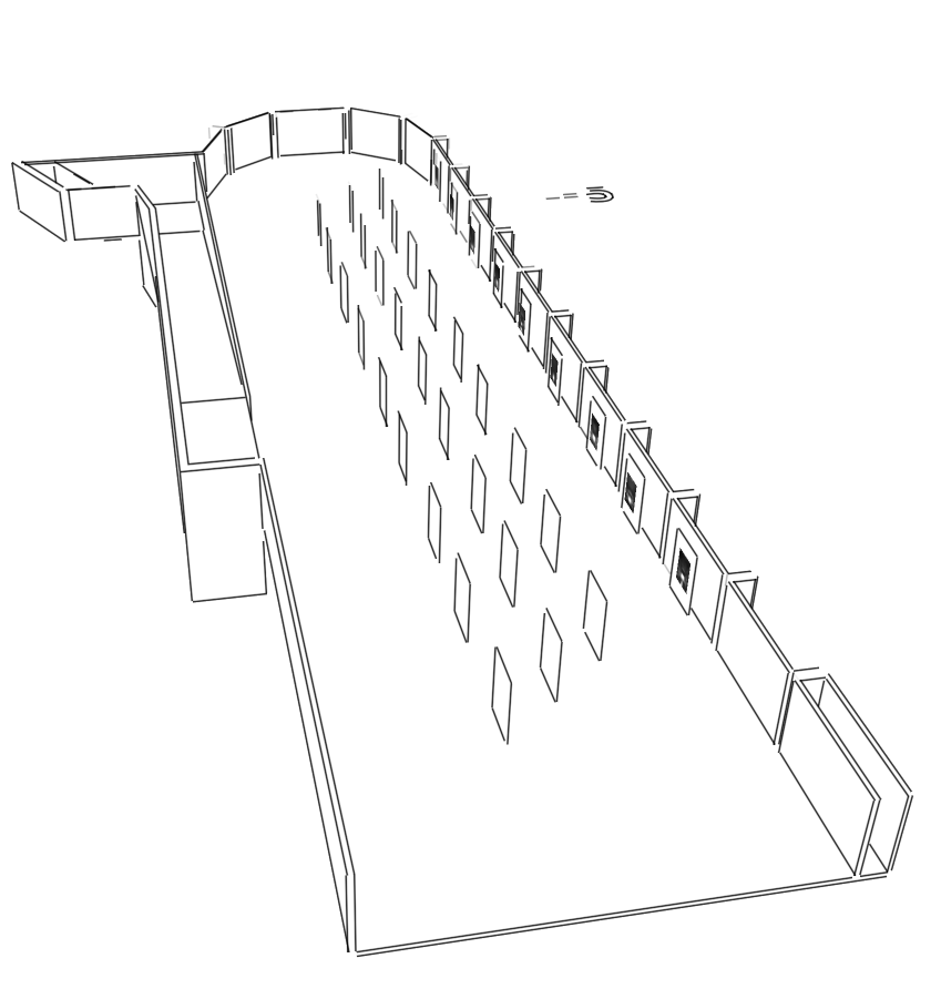 Le quadrillage disposé au plafond prolonge la perspective et agit comme une trace.