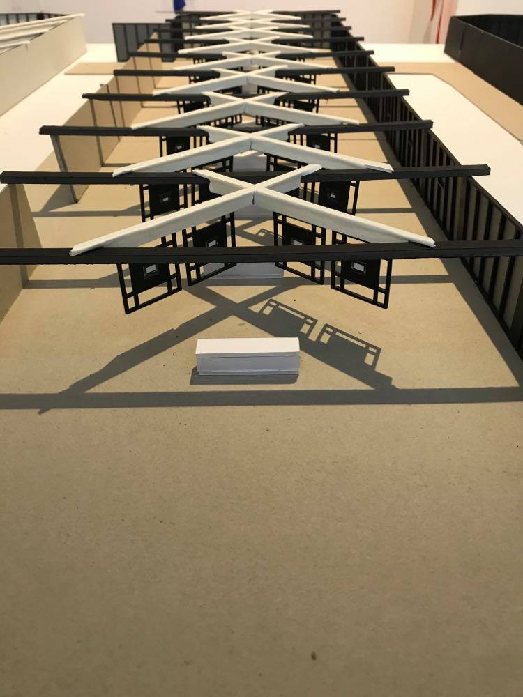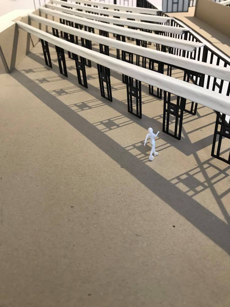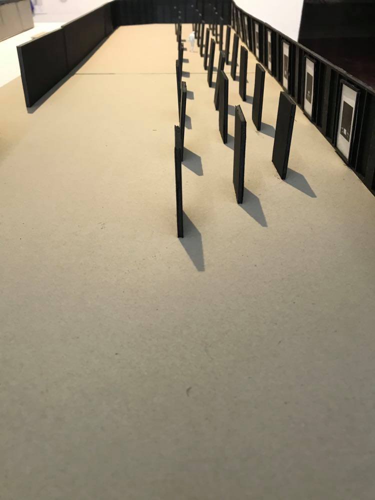 J’ai créé un rythme avec les châssis qui présentent les photographies. Disposés en diagonales, les portants créent un quadrillage et des perspectives en traversant ce long espace d’exposition, et deviennent un motif. Ils font le lien entre le travail d’Hiroshi