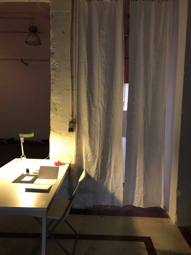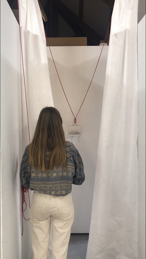 Cette installation participative présente le concept de la limite sous la forme de la liminalité. La liminalité (qui vient du Latin «limen », qui signifie « seuil ») est le moment du rituel pendant lequel l’individu a perdu un premier état et n’a pas encore accédé à un second statut. (définition de Van Gennep dans son essai, Les rites de passage, 1909) Il est alors dans une situation intermédiaire et se situe entre deux états. Cette étape transitionnelle est ici matérialisée par un rideau que la personne traverse. Pour faire l’expérience de ce rideau purgatoire, voici la marche à suivre :